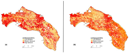 The distribution of LS demand potentially associated with the land covers has been mapped in 2011 (Figure 6a) and in 2021 (Figure 6b). It is possible to underline that the demand has increased from 2011 to 2021 in the areas characterized by the infection of Xylella fastidiosa because olive growth has seen a conversion in land covers with an increased demand for more services.