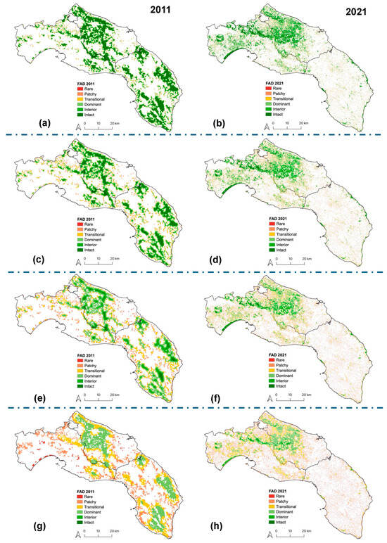 Moving to the multiscale spatial analysis, we used the Foreground Area Density (FAD) in the Guidos toolbox to assess the olive grove landscape fragmentation at different spatial scales. This is a recent and commonly used metric to analyze landscape fragmentation, and it has been applied to the “Olive groves” land-cover class. Four different spatial scales characterized by a different extent (7 × 7, 13 × 13, 27 × 27, 81 × 81 pixels) have been used for the years 2011 and 2021. In each map, the resulting values have been divided into six classes (rare, patchy, transitional, dominant, interior, and intact) (Figure 7).