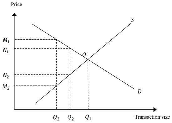 Within the framework of secure property rights, trust—an essential component of informal institutions—can diminish the communication barriers and the inclination towards opportunistic conduct in resource exchanges between rural residents in the villages. This, in turn, facilitates the efficient distribution and circulation of inter-organizational resources, promoting land transfer and positively influencing rural economic growth and the establishment of social order [12]. In particular, social trust can alleviate information asymmetry and reduce farmers’ concerns about potential opportunistic behavior, thereby reducing the transaction costs associated with land transfer [20,22,36]. Referring to Figure 2, under the condition of market clearing, i.e., when there are no transaction costs in land transfer, the demand and supply curves of land transfer intersect at point , and the transaction size is . However, the transaction cost is still unavoidable in the actual market even without risk factors such as blurred property rights boundaries. It forms a “wedge effect” between the supply and demand curves of land transfer, leading to the actual market transaction size and the actual market transaction size . However, even without risk factors such as blurred property boundaries, transaction costs remain inevitable, creating a “wedge effect” between the supply and demand curves in the land transfer market. This effect reduces the actual market transaction size to . Social trust in the land transfer market functions to diminish information asymmetry, leading both parties to believe that the other will not act opportunistically to undermine their interests. As a result, there is less need to repeatedly verify the authenticity of information before the transaction or take precautionary measures against default. Trust can effectively reduce market transaction costs and improve market efficiency.