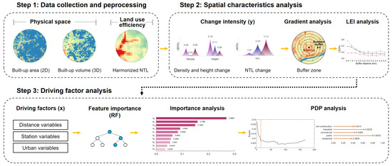The research workflow, depicted in Figure 1, comprised three main steps: (1) data collection and preprocessing, involving multisource remote sensing data collection, preprocessing, normalization, and buffer zone analysis of HSR stations; (2) spatial analysis, which examined the 2D and 3D spatial development patterns of the built-up areas surrounding the HSR stations through indicators such as built-up density and height, where the change in NTL intensity was employed to illustrate changes in land use efficiency; (3) driving factor analysis, which used changes in the built-up area density, height, and NTL as dependent variables and used distance variables, station variables, and urban variables as independent variables. Interpretable machine learning methods were employed to reveal the shaping effect of the HSR on the spatial patterns of the surrounding areas.