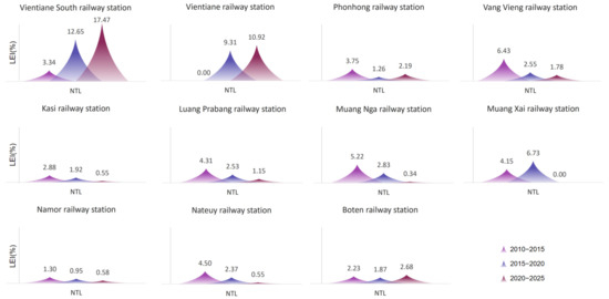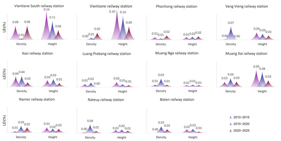 Figure 3 shows how built-up density and height changed around the 11 HSR stations on the Laos section of the CLR. Higher LEI scores indicate more changes in land development near that station. The LEI during the preconstruction stage was usually lower than that in the construction stage, statistically significant at the 0.0047 level, showing that the railway construction greatly influenced the density of the built-up areas around these stations. Different stations showed different changes during the CLR construction and operation stages, which could be grouped into two main types: (1) changes dominated by CLR operation and (2) changes dominated by CLR construction. The first type included the Vientiane South railway station, Vientiane railway station, and Phonhong railway station, where the density of the LEI around these stations was higher during the operation phase. This might have been due to their proximity to the capital city and the nearby capital metropolitan area, which have more active factor flows, triggering more active spatial responses. The second type included the other stations, where land expansion around these stations was more significant during the CLR construction stage. Notably, the urban space near Vang Vieng railway station showed the biggest changes during the CLR construction phase. These stations are located in areas with relatively weak socioeconomic foundations, which lack the capability to respond properly to HSR operations. Thus, these stations usually experienced a phased spatial spillover effect from the construction of major infrastructure projects.