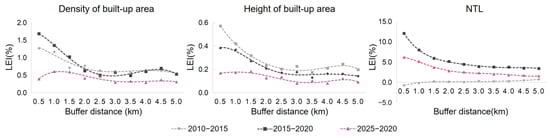 Figure 6 shows the gradients of the changes in the various landscape indicators within a 5.0 km buffer zone around the stations. Land use changes around the stations exhibited a distinct distance-decay characteristic during both the construction and operation phases of the CLR, with the change intensity decreasing as the distance increased. The changes in density and height were especially noticeable within a 3.0 km. As exemplified in Figure 5, Vang Vieng railway station exhibited a significant thresholding effect over its surrounding space compared to the other two stations. This could be attributed to the superior urban development foundations of the parent cities, which inherently foster development in their surrounding areas. Similar change patterns were noticed in the surrounding areas even before the CLR was built, suggesting that this region was already developing. NTL changes, however, followed the same distance-decay rule throughout the 5.0 km area, with the effects of CLR construction and operation being higher than those during the preconstruction stages. This means that the implementation of HSR stations significantly boosted human activities and improved land use efficiency. However, the results in Figure 5 indicate that the observed NTL threshold effects varied among the different stations. Vientiane and Vang Vieng railway stations exhibited distinct threshold effects within the 5.0 km range, while Muang Xai railway station showed distance-decay threshold effects within a range of less than 5.0 km.