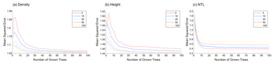 The key parameters for the RF models used in this study were the number of trees (searched in a range of 10 to 100) and the minimum leaf size (searched in a range of 5 to 100). These parameters were tuned to minimize the mean squared error (MSE), with a lower MSE indicating a better model fit. As shown in Figure 7, the optimal parameter values for density and height were found to be approximately 40 trees and a minimum leaf size of 15. For NTL, optimal parameter values were determined to be 20 trees and a minimum leaf size of 5, which were sufficient to achieve high accuracy.