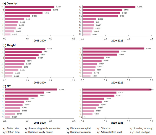 During the CLR construction stage, “Distance to capital” (x5) and “Land use type” (x10) significantly influenced density and NTL. “Surrounding traffic connection” (x3 = 0.1611) and “Distance to city center” (x4 = 0.1477) significantly influenced built-up height. During the CLR operation stage, “Distance to capital” (x5) showed a significant influence on all factors, including density, height, and NTL. Additionally, “Distance to city center” (x4 = 0.1706) and “Land use type” (x10 = 0.154) significantly influenced density; “Station type” (x2 = 0.0921) and “Land use type” (x10 = 0.1495) significantly influenced built-up height; “Station size” (x1 = 0.1479) and “Leading industry” (x9 = 0.1390) dominated the NTL change.