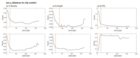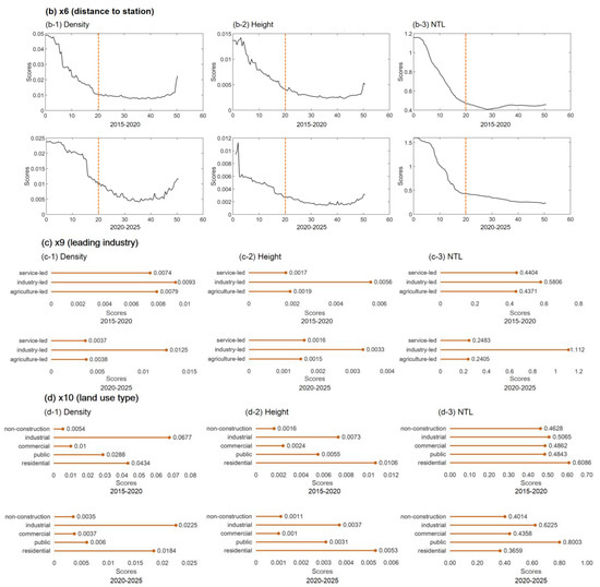 Figure 8 presents the importance of the various influencing factors; a larger value indicates that the factor was more important than the dependent variable. As the results depicted, “Distance to station” (x6) was the primary factor affecting the spatial development around the stations during both the construction and operation stages. This is consistent with the distance-decay principle observed above.