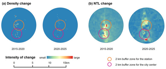 PDP analyses were carried out to further reveal how the critical factors including the distance variables and urban functional variables influenced the land use patterns. These variables represent crucial dimensions that can be managed by spatial governance strategies such as urban planning and design during the HSR construction stage (Figure 9). Figure 9a indicates that “Distance to city center” (x4) negatively correlated with density, height, and NTL overall. However, NTL illustrated a positive correlation during the operation stage. Generally, each dependent variable exhibited a threshold effect, where the dependent variable changed rapidly when the distance was below this threshold while tended to be stable when the distance was beyond this threshold. Specifically, for built-up height, the threshold for change was 4 km during the construction stage, while all were around 2 km for the other dependent variables. Figure 9b shows that “Distance to station” (x6) also negatively correlated with density, height, and NTL. When “Distance to station” (x6) was below 2 km, the built-up intensity increased rapidly; however, when the distance exceeded 2 km, the changes became stable. The 2 km threshold likely reflects the walking distance that residents were willing to tolerate. Individuals typically accept walking for up to 0.5 h, which corresponds to a distance of approximately 2 km. Beyond this distance, accessibility diminishes, potentially leading to a reduction in the extent of the spatial development changes. This finding aligns with those in the existing research [29], which demonstrates a significant increase in land use dynamics within 2 km of railway lines. This conclusion is further supported by examining the specific case stations (Figure 10).