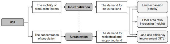 The spatial spillover effects of HSRs usually occur around HSR stations [5]. HSR stations are crucial links that connect cities, providing essential opportunities and driving forces for urban expansion [6]. The attractiveness of local investment increases as urban accessibility improves, introducing new urban projects [7]. These developments also enhance public services and infrastructure [8], promoting economic activity concentration and industrial structure restructuring [9]. Establishing HSR stations also promotes urban development by facilitating population mobility and concentration [10].