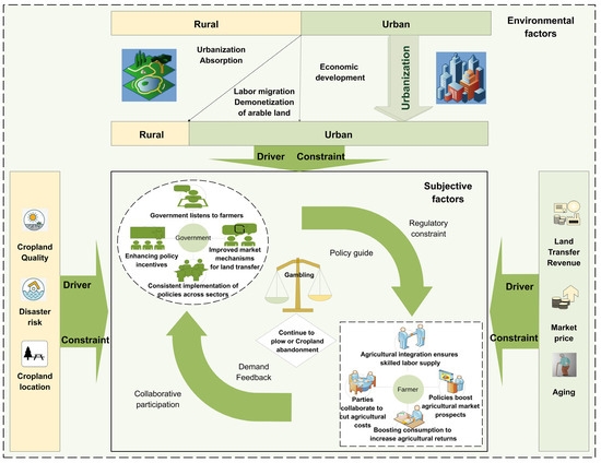 To facilitate a more in-depth examination of the mechanisms underlying farmland abandonment through evolutionary game modeling, we constructed an analytical framework that encompasses both environmental and subjective factors (see Figure 1).