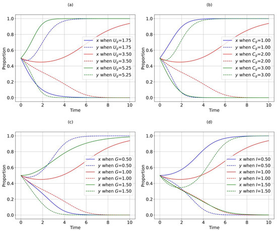 Figure 2. Government behavioral parameters in constraining farmers’ land abandonment: (a) the impact of Ug; (b) the impact of Cg; (c) the impact of G; (d) the impact of I.