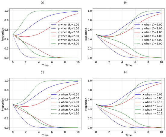 Figure 3b illustrates that the cultivation costs (Cf) incurred by farmers when they do not abandon their land also positively influence their willingness to abandon it. When Cf = 2, farmers exhibit a weak inclination toward abandoning their land, with y approaching 0. At Cf = 4, their willingness to abandon their land strengthens, but y still trends towards 0; as Cf increases, y approaches 1. Here, higher cultivation costs—including expenses for seeds, fertilizers, pesticides, and labor—lead farmers to consider the cost–benefit analysis, making them more likely to abandon farming and opt for land abandonment to alleviate economic pressure.
