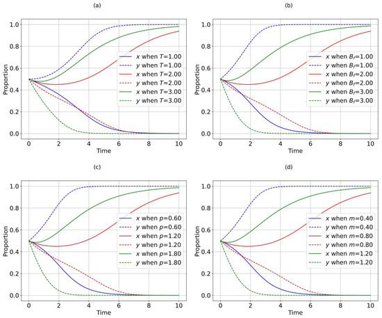 Figure 4. Constraints of land abandonment among farmers’ own factors: (a) the impact of T; (b) the impact of Bf; (c) the impact of p; (d) the impact of m.