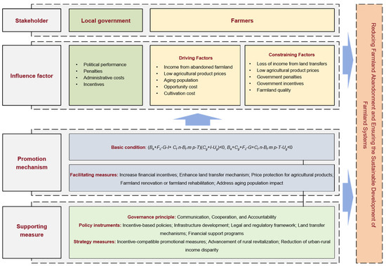 The research presented in this paper offers valuable insights for tackling the challenges of farmland abandonment. Based on the discussed findings and theoretical perspectives, we have developed a management framework aimed at effectively mitigating the problem of land abandonment through a comprehensive approach, while ensuring national food security and promoting stable rural economic development (see Figure 5).