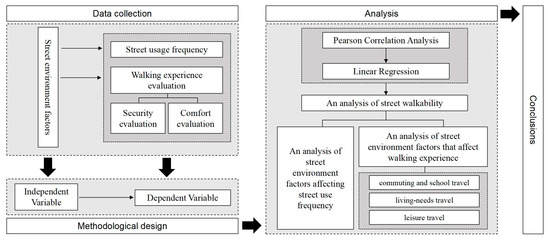 In this study, street walkability is defined using two key indicators: street usage frequency and a walking experience evaluation. Rather than solely evaluating street walkability, the research focuses on exploring its relationship with the street environment. This relationship is investigated using the two dependent variables (street usage frequency and walking experience evaluation) as summarized in Table 2.