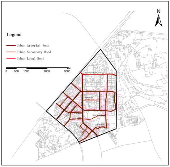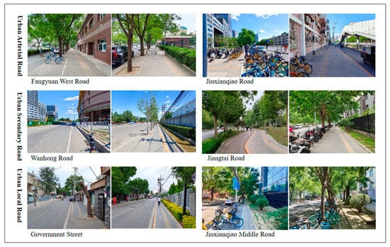 This study considers individual road sections as the primary units for analyzing environmental factors influencing street walkability. Widely used urban streets were selected for the analysis, including urban arterial roads, urban secondary roads, and urban local roads, totaling 25,144 m in length. Long streets were segmented based on the urban layout and intersection characteristics to ensure a precise evaluation (Figure 2). The images depicting current conditions of different representative urban roads are detailed in Figure 3.