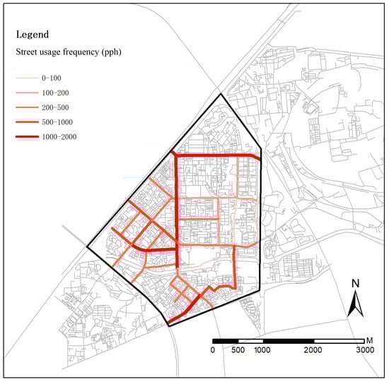 Significant differences were observed in the usage frequency of streets within the study area, with the most frequently used streets being up to ten times busier than the least used ones, as illustrated in Figure 4.