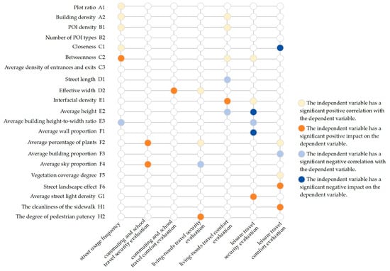 Among the street environment factors affecting the living-needs travel experience, as shown in Table 7, the effective width (r = 0.757), average percentage of plants (r = 0.465), and pedestrian patency (r = 0.815) were significantly positively correlated with the evaluation of living-needs travel security, while average sky proportion (r = −0.607) was significantly negatively correlated with the evaluation of living-needs travel security. The degree of pedestrian patency (p = 0.040 < 0.05) had a significant positive effect on the sense of living-needs travel security; building density (r = 0.442), POI density (r = 0.533), betweenness (r = 0.476), and interfacial density (r = 0.820) were significantly positively correlated with the evaluation of living-needs travel comfort. Average height (r = −0.447) and street length (r = −0.440) were significantly negatively correlated with walking comfort, while interfacial density (p = 0.006 < 0.05) had a significant positive effect on it.