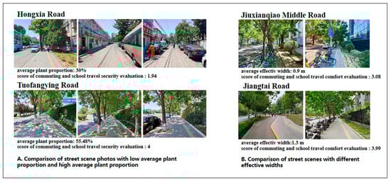 Among the three travel types, the primary groups for commuting and school travel are commuters and parents with children, whose trips are constrained by strict destination and time limitations. Therefore, it is crucial to enhance both the average sky interface proportion and the average percentage of plants in street walking spaces to avoid creating overly oppressive or narrow street atmospheres. Improving the openness of space will help ensure the security of necessary walking activities. Additionally, addressing issues such as non-motor vehicle parking through improved construction and management, expanding tree pits, widening pedestrian paths, and enhancing road traffic capacity will improve both the comfort and functionality of these necessary trips. The effective width of sidewalks plays a key role in the comfort of commuting and school travel, which aligns with common perceptions that the comfort of walking depends on pedestrian movement efficiency. A sufficiently wide pedestrian path allows commuters or parents and children to reach their destinations quickly without being hindered by detours, conflicts with non-motorized vehicles, or crowding, ensuring smooth and efficient passage. A further analysis of street views with varying effective passage widths reveals that non-motorized vehicles frequently obstruct pedestrian paths, a problem observed on both primary and secondary urban roads (Figure 6). In the context of current urban regeneration based on the existing stock, expanding walkable spaces along urban arterial and secondary roads through roadside landscape renewal can help alleviate the issue of insufficient pedestrian space.