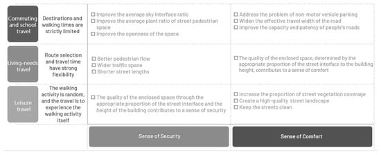 Based on the analysis of psychological needs, walking experience was categorized into walking safety and comfort experiences (Table 3).