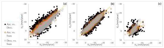 Comparison of the vertical displacement velocity derived using the Sentinel-1 datasets, for (a) Rome, (b) Bologna, and (c) Florence. The linear regression between ascending and descending mode geometries is represented with a dashed yellow line. Notation: ‘Asc.’, ascending; ‘Desc.’, descending; ‘Sum’, combined ascending and descending.