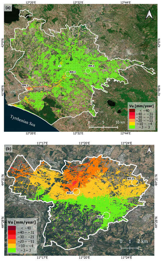 Vertical displacement velocity (VU) maps of the 2018–2022 period for the city of Rome (a), Bologna (b), and Florence (c). PSInSAR data are overlapped onto Google Earth imagery.