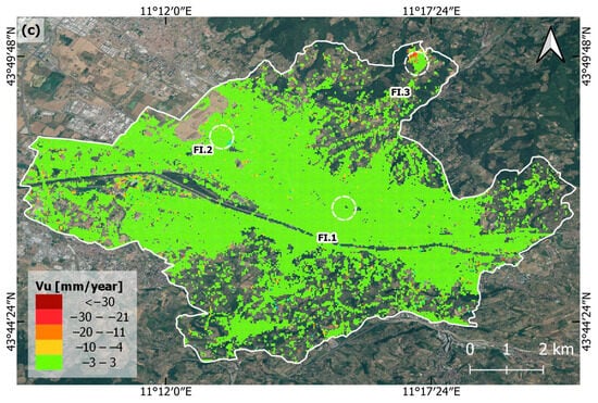 The application of multi-temporal and multi-sensor PSInSAR analysis yielded detailed ground deformation velocity maps, revealing subsidence evolution in both spatial and temporal dimensions over the last thirty years. The 50 m resolution vertical displacement velocity (VU) maps obtained by combining ascending and descending mode datasets (see Section 4.1) are shown in Figure 3, corresponding to the latest period analyzed for the cities of Rome (Figure 3a), Bologna (Figure 3b), and Florence (Figure 3c) (while the maps of the different temporal periods area provided in Figure A1, Figure A2 and Figure A3 in Appendix A). Negative VU values indicate land subsidence, while positive values indicate uplift. A range of –3 to +3 mm/year was considered to identify stable values (displayed as green areas in Figure 3). It is worth noting that spatial gaps in the coverage of the deformation products across the study areas indicate zones not covered by the PSInSAR results, due to the lack of PS (e.g., attributable to temporal decorrelation over rural lands, not allowing the identification of good radar reflectors across the image stacks).