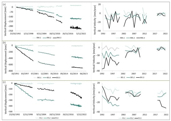 Three specific areas were selected for each city to evaluate their temporal behavior in detail, one considered stable (RM.1, FI.1, BO.1) and two considered hotspots of ground displacement (RM.2, RM.3, FI.2, FI.3, BO.2, BO.3); though, it is important to note that this same analysis could be replicated in detail for each processed pixel.