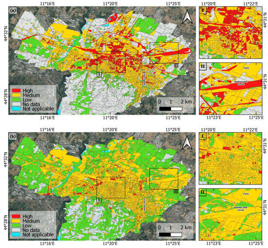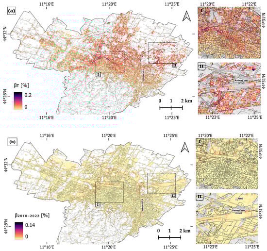 Bologna hazard maps, representing (a) the 30-year period angular distortion, βT, and (b) the 2018–2022 period angular distortion, β2018–2022. The 2018 Urban Atlas layer is superimposed and zooms (I) and (II) are overlapped onto the OpenStreetMap on grey scale.