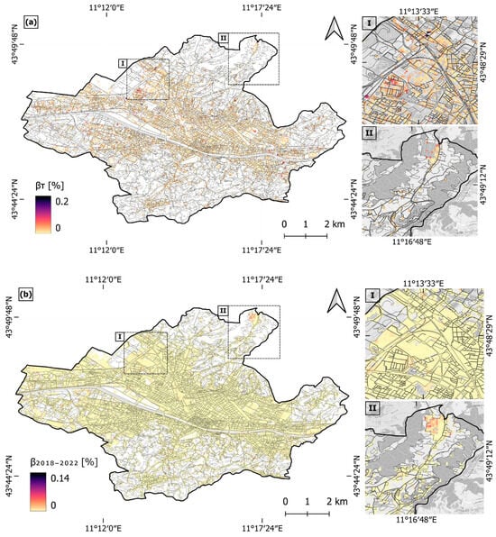 Florence hazard maps, representing (a) the 30-year period angular distortion, βT, and (b) the 2018–2022 period angular distortion, β2018–2022. The 2018 Urban Atlas layer is superimposed and zooms (I) and (II) are overlapped onto the OpenStreetMap on grey scale.