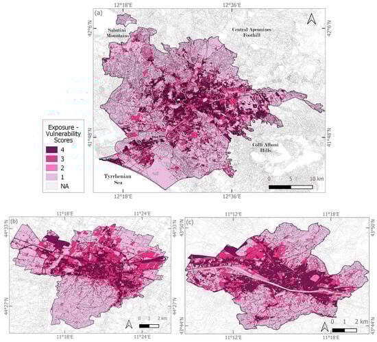 Exposure–vulnerability of urban infrastructure in (a) Rome, (b) Bologna, and (c) Florence, based on scoring of UA 2018 classes.