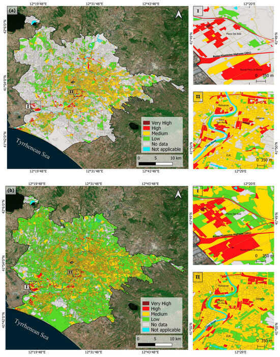 Rome hazard maps, representing (a) the 30-year period angular distortion, βT, and (b) the 2018–2022 period angular distortion, β2018–2022. The 2018 Urban Atlas layer is superimposed and zooms (I) and (II) are overlapped onto the OpenStreetMap on grey scale.