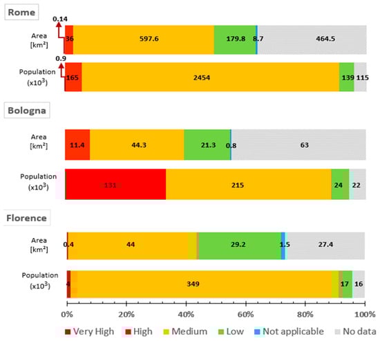 Overview of the subsidence-induced risk mapping statistics for Rome, Bologna, and Florence in 1992–2022, highlighting the amount of square kilometers of land and population involved in each risk category. Note that each bar represents 100% of the area of each city.