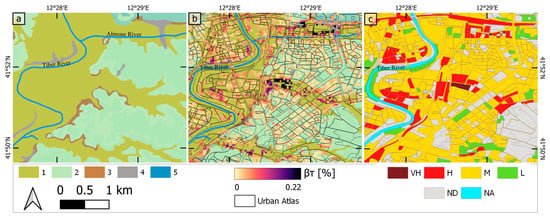 Location and land use/cover of the cities of (a) Rome; (b) Bologna, and (c) Florence in Italy, according to the Copernicus Urban Atlas (UA) 2018 dataset [24]. Land use/cover types associated with UA codes are provided in Table 1.
