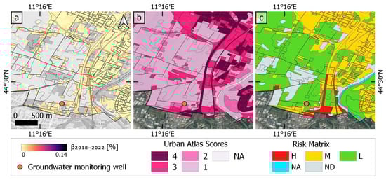 Example of correlation between groundwater extraction, subsidence, and derived risk in Bologna: (a) 2018–2022 angular distortion values with Urban Atlas polygons superimposed. The orange dot represents the position of ARPAE’S groundwater monitoring well (modified from [38]). The recorded change in its piezometric level is −11.45 m. (b) Exposure–vulnerability of urban infrastructure. (c) Risk map for the 2018–2022 period.