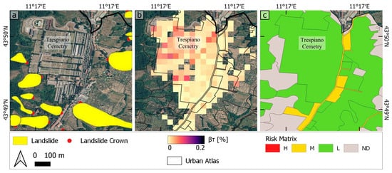 Example of correlation between landslide processes and ground displacement measured in Florence. (a) Shows the landslides in the study area, obtained from the Italian Landslide Inventory (IFFI project), (b) total angular distortion map, and (c) the risk matrix map.