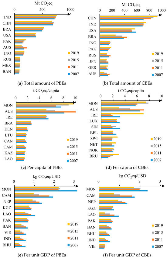 Aligned with national attributes, India and China, with the highest total GHG emissions, had low per capita GHG emissions. With the expansion of the population base, India’s per capita PBEs and CBEs showed a downward trend. With the adjustment of economic structure, China’s PBEs per capita decreased by 0.05 tCO2eq per capita from 2007 to 2019, while the CBEs per capita showed a reverse evolution trend, increasing by 0.12 tCO2eq per capita. In contrast, Australia, Brazil, and the United States had both large per capita GHG emissions and large total emissions. Due to the shale gas revolution, the per capita PBEs and CBEs in the United States declined, but it still ranked 13th in 2019 with 1.18 tCO2eq per capita PBEs, while for CBEs, it ranked 11th with 1.72 tCO2eq per capita.
