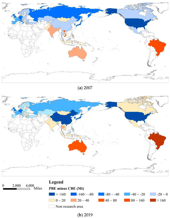 Figure 2 presents the differences between PBEs and CBEs by geographical distribution. Countries like the United States, Japan, China, the United Kingdom, and Germany, with considerable CBEs, address a larger loading portion for GHG emissions in agricultural consumption, while Brazil, Australia, Thailand, and India assume more loading for PBEs in agricultural GHG emissions. In 2007, the CBEs of the United States were 205.43 Mt CO2eq higher than the PBEs, with a gap that narrowed to 178.62 Mt CO2eq by 2019. Interestingly, China’s PBEs and CBEs in agricultural GHG were relatively balanced in 2007, while the difference, i.e., PBEs excess CBEs, rapidly climbed from −16.73 to −263.71 Mt CO2eq in 2019. The huge gap shows that China has increased its emphasis on the agricultural consumption side, achieved via international agricultural trade, as the growth rate of CBEs is much higher than that of PBEs by 2.60%.