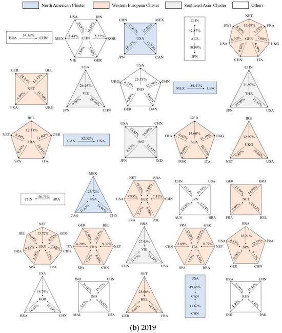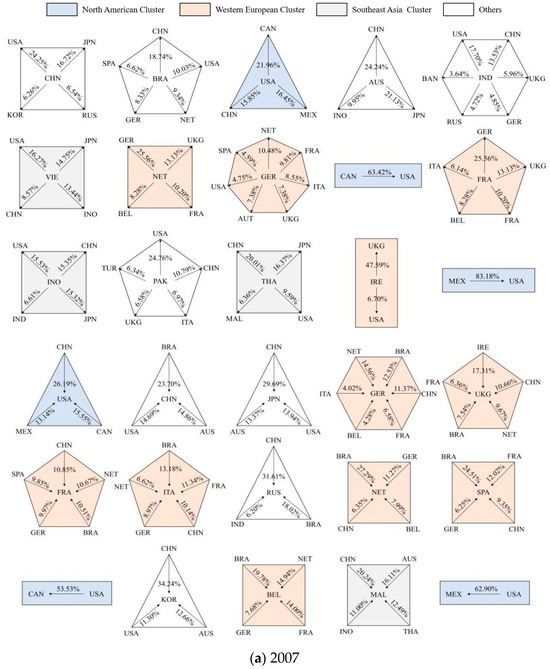 Figure 5 presents the embodied agricultural GHG clusters measured by outflows and inflows in 2007 and 2019. Regarding the agricultural GHG outflows, Canada, Mexico, and the United States formed an internal cluster in North America. Simultaneously, the Netherlands, Germany, and France remained core members of the Western European cluster, displaying a relatively balanced pattern for European countries but with reduced concentrations in 2019. In contrast, Ireland’s pattern was more concentrated, especially its outflows to the United Kingdom in 2007. With a decline in the scale of Irish outflows in 2019, Spain and the United Kingdom both increased their positions in the European cluster. In the Southeast Asia cluster, Vietnam, Indonesia, and Thailand exhibited close ties with other Asian countries, which have different evolutionary relationships with East Asia, Southeast Asia, and North America in 2019. In addition, the regional cluster characteristics in China, Brazil, Australia, India, and Pakistan were not evident in 2007, and their main outflows were not limited within their regions. However, Brazil and Australia’s balanced connection in agricultural GHG emissions was broken in 2019.