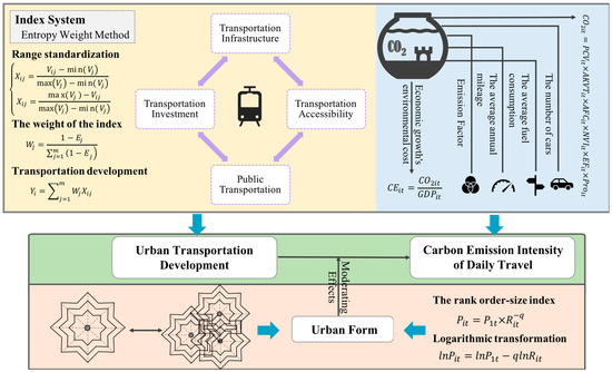Urban form refers to the characteristics and spatial configuration of urban components [12,13]. It is closely linked to urban transportation development, with significant interactions and mutual constraints between the two. The relationship between urban form and transportation development is dynamic, as cities at different stages of development exert varying impacts on urban layout, influenced by their dominant modes of transportation. In turn, urban form shapes the direction of transportation system development. Different urban forms prioritize and develop transportation systems that best align with their spatial characteristics and needs, thereby optimizing transportation efficiency. Consequently, urban form can affect the efficiency of transportation operations and energy consumption [14]. Theoretically, urban forms can be categorized into different types. In terms of spatial distribution, compact cities are generally more conducive to the development of public transportation and non-motorized travel than dispersed cities, as they help increase the potential user base for public transportation [15,16]. In terms of land use, mixed land-use patterns promote low-carbon travel options, thereby reducing carbon emissions [17]. This coupled relationship further shapes the travel patterns of urban residents and the resulting carbon emission characteristics. However, existing research has primarily focused on the direct impact of urban form on daily travel carbon emissions, overlooking the interactive relationship between urban form and transportation development. Therefore, this paper uses urban data to explore the moderating effect of urban form on the relationship between transportation development and daily travel carbon emissions.
