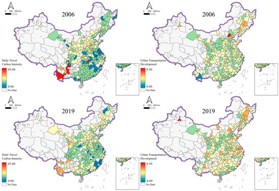 Spatial Distribution of Daily Travel Carbon Emission Intensity and Urban Transportation Development Levels.