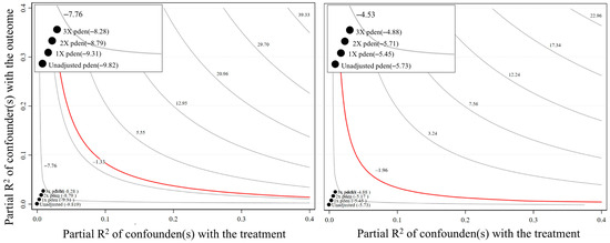 Sensitivity Analysis. Predicted intensity of carbon emission intensity from urban transportation development at sensitivity at baseline boundaries of 1×, 2×, and 3× on a biased R2 scale. The left panel shows the sensitivity contour plots for point estimates; the right panel shows the sensitivity contour plots for t values. Note: The dots in the figure indicate the strength of the prediction of carbon emission intensity by urban transportation development at sensitivities of 1×, 2×, and 3× at the baseline limits on the biased R2 scale. The left panel shows contour plots of sensitivity for point estimates; the right panel shows contour plots of sensitivity for t values.