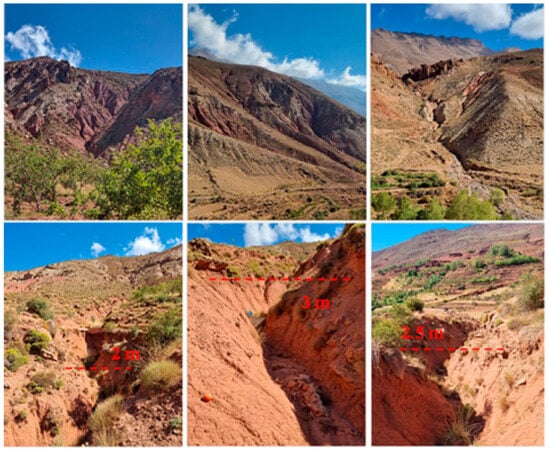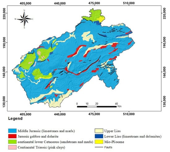 The topography of the watershed of Oued El Abid is marked by three topographic forms, namely the mountainous massifs, which are characterized by steep slopes from 40° to 80°, and the plateaus and depressions, which are characterized by low values of slopes generally from 0° to 11°, extending mainly along the streams. The altitude ranges from 763 m to 3697 m, averaging 1373 m above sea level. From a climatic perspective, Morocco’s geographic location gives it a highly contrasting climate, characterized by significant spatial and temporal irregularities in rainfall [34]. The Oued El Abid basin, as a typical South Mediterranean area, is characterized by a semi-arid climate with warm-to-hot dry summers and mild-to-cool wet winters. The average maximum temperature reaches 42 °C during July and August, while the average minimum temperature drops to 6 °C in January and February. The average annual rainfall varies significantly, ranging from 119 mm in the southern part of the basin to 738 mm in the northern part. Snowfall occurs exclusively at the highest altitudes, particularly in the eastern and southeastern parts of the basin, where the elevations are the highest [35]. In the study area, the soils are composed of various types, including lithosols, regosols, xerosols, luvisols, cambisols, rendzinas, phaeozems, kastanozems, and gleyic solonchaks [36]. These soils exhibit diverse characteristics, influencing their varying levels of susceptibility to erosion. From a lithological standpoint, the region is mostly covered with carbonate rocks from the Late and Middle Jurassic dated from the Jurassic, with a syncline filled by continental formations called Jurassic–Cretaceous red layers (Figure 2).