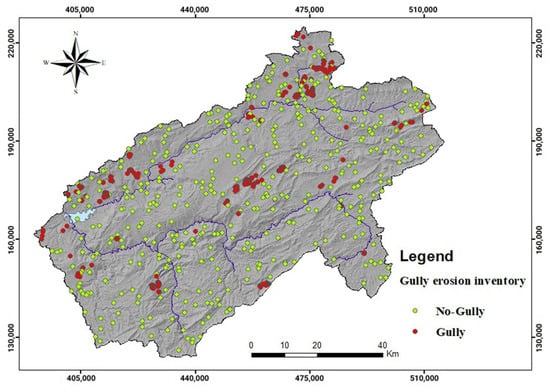 In this research, the gully inventory map contained 200 locations of gully locations and an equal number of no gully locations (200 pixels). Gully locations were identified and plotted as points using field observations and high-resolution Google Earth images (Figure 4 and Figure 5). No gullies were randomly selected using the random point tool in GIS environment.