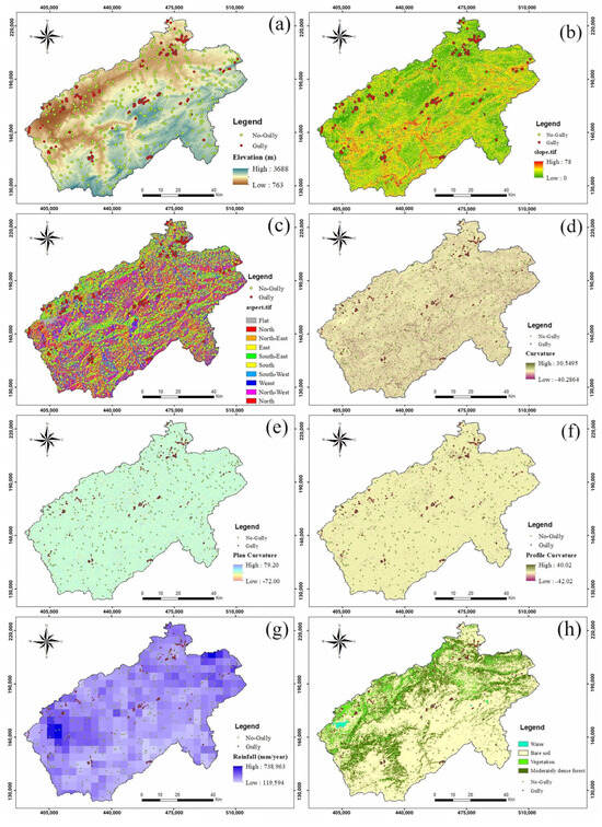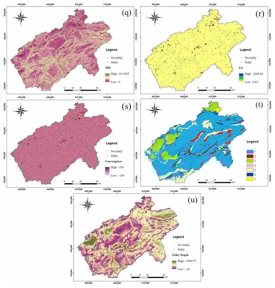 Gully conditioning factors: (a) elevation, (b) slope, (c) aspect, (d) curvature, (e) plan curvature, (f) profile curvature, (g) rainfall, (h) LULC, (i) NDVI, (j) drainage density, (k) distance to river, (l) distance to roads, (m) geomorphons, (n) TWI, (o) SPI, (p) TPI, (q) TRI, (r) LS, (s) convergence, (t) lithology, (u) valley depth.