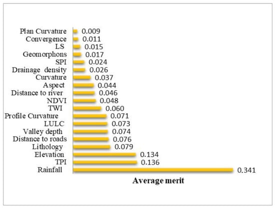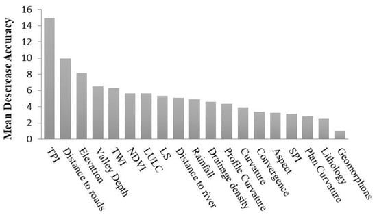 Mapping any hazard using the same factors is not practicable in all areas [48]. In the case of GES modeling, certain gully conditioning factors may produce noise that minimizes the prediction power of the model and may have little ability to predict the results [49]. Therefore, it is necessary to recognize and select the importance of gully conditioning factors before the model’s validation [50].