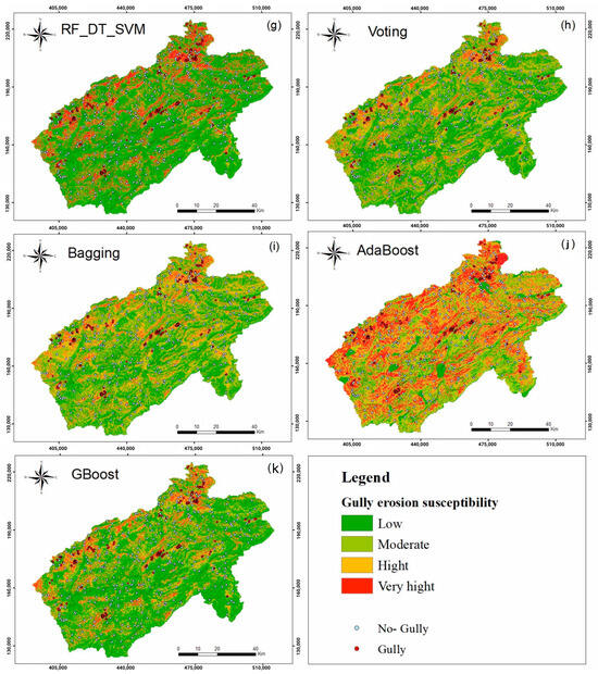 - Production of gully erosion susceptibility maps, using individual models RF, DT, and SVM and different ensemble models such as stacking, voting, bagging, and boosting.