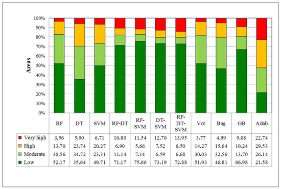 However, the data quality and comprehensiveness used in this study played a crucial role in the accuracy of the results. We incorporated an extensive set of conditioning factors, including geological, hydrological, topographical, and anthropogenic factors, which significantly contributed to the reliability of the models. Additionally, a representative inventory of gully locations in our region further ensured the robustness of our findings. It is important to acknowledge that the application of this methodology in other regions might yield different results. The performance and accuracy of the models are highly dependent on the quality and representativeness of the data available for the specific study area. Therefore, for optimal results, this methodology is best suited for regions with similar characteristics to our study area and where sufficient and representative data are available. The ensemble methods used, especially the RF-SVM-DT stacking ensemble model, demonstrated high accuracy and reliability in predicting gully erosion susceptibility. These models can effectively handle complex relationships between multiple conditioning factors, providing detailed and precise susceptibility maps.