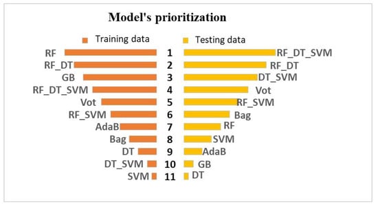 Based on the multi-collinearity test, the correlation matrix, and the IG method, two factors were eliminated from the analyses. According to the RF method, the TPI was selected as the most important conditioning factor for gully erosion in the study watershed, followed by distance to road and elevation. Geomorphons, lithology, and plan curvature had a relatively low effect. Three individual models—RF, DT, and SVM—were applied. Moreover, different ensemble models—voting, bagging, boosting, and stacking ensemble—based on the first individual models were developed to improve the performance and the capability of predicting GES maps.