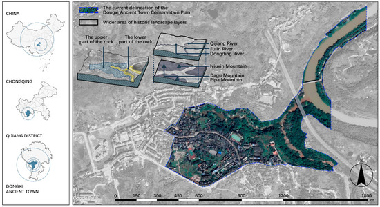 Dongxi Ancient Town, recognized as a national historic and cultural town, embodies over two millennia of historical layering. The town’s form and functions have undergone multiple phases of transformation and overlay, revealing distinct trajectories of change across various periods and presenting a current state of multicultural coexistence—making it an exemplary case for change analysis. Located in the southern part of Qijiang District, Chongqing (Figure 1), Dongxi lies strategically along the Qijiang River, which flows into the Yangtze River and stretches upstream to Guizhou, fostering extensive water and land connectivity. Historically, Dongxi served as a bustling port and commercial hub. The town’s origins trace back to the Wanshou Market of the Western Han dynasty, evolving into Dongxi Town in the Tang dynasty. By the Ming and Qing dynasties, it had become a center for trade, salt transport, and migration, and during the Republic of China, it served as a vital rear base in the War of Resistance Against Japanese Aggression. With a rich layering of spatial and temporal, tangible and intangible historical landscapes, Dongxi is an ideal subject for research on layering and transformation. The current resident population of Dongxi Ancient Town is approximately 24,000. The town includes four main areas: Shuyuan Street—Chaoyang Street—Bei Street, Shangping Bridge, Taiping Bridge—Yongjiu Bridge, and Chengpingtan, covering a total area of 26.73 hectares. This constitutes the primary scope of the study.