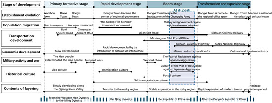 The dominant demands and primary contradictions at each historical stage directly determine the direction and content of the ancient town’s development, serving as the driving forces behind the evolution of its historical landscape layering. The historical process of Dongxi Ancient Town was divided into four phases: the primary formative phase (from the Western Han to the Ming Dynasty), the rapid development phase (Qing Dynasty), the prosperous phase (Republic of China), and the transformation and expansion phase (post-establishment of the People’s Republic of China) (Figure 3). This section primarily aimed to identify the evolutionary processes and layered content of the various elements in Dongxi Ancient Town from a diachronic perspective, analyzing the main demands and contradictions characteristic of each developmental stage.