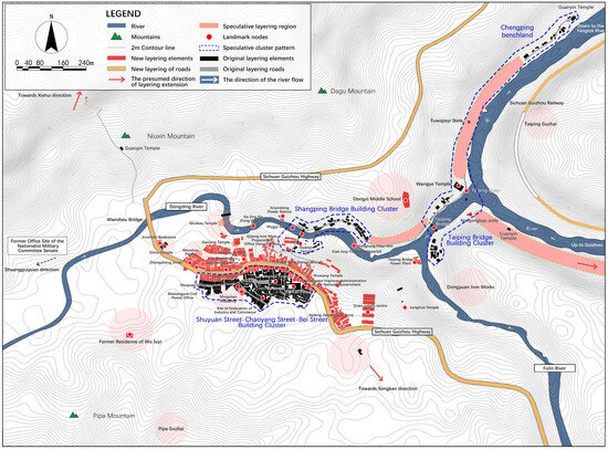 At the meso level, the Dongxi section of the Sichuan-Guizhou Highway was temporarily redirected through the town due to the original route along the river being predominantly composed of hard rock layers. The highway was constructed parallel to the Wanshou Bridge, following the alignment of the Shuyuan Street-Chaoyang Street-Bei Street cluster, resulting in the coverage of a significant number of existing residences and farmland, which were replaced by the highway and the new buildings constructed in the period of the Republic of China on both sides. Following the full-scale outbreak of the Anti-Japanese War, “Zhongzheng Street” was established along the Sichuan-Guizhou Highway to accommodate the relocated officers and their families, leading to a proliferation of shops and offices [50] (p. 61) and a complete development of the ancient town’s street system characterized by “Three Streets and Seven Lanes”.